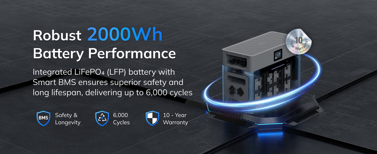 2000Wh LiFePO₄ Battery, Expandable to 10kWh – Built-in BMS ensures 6,000 cycles, 10-year design life (plus 5-year warranty). Stackable modules grow with your energy needs.