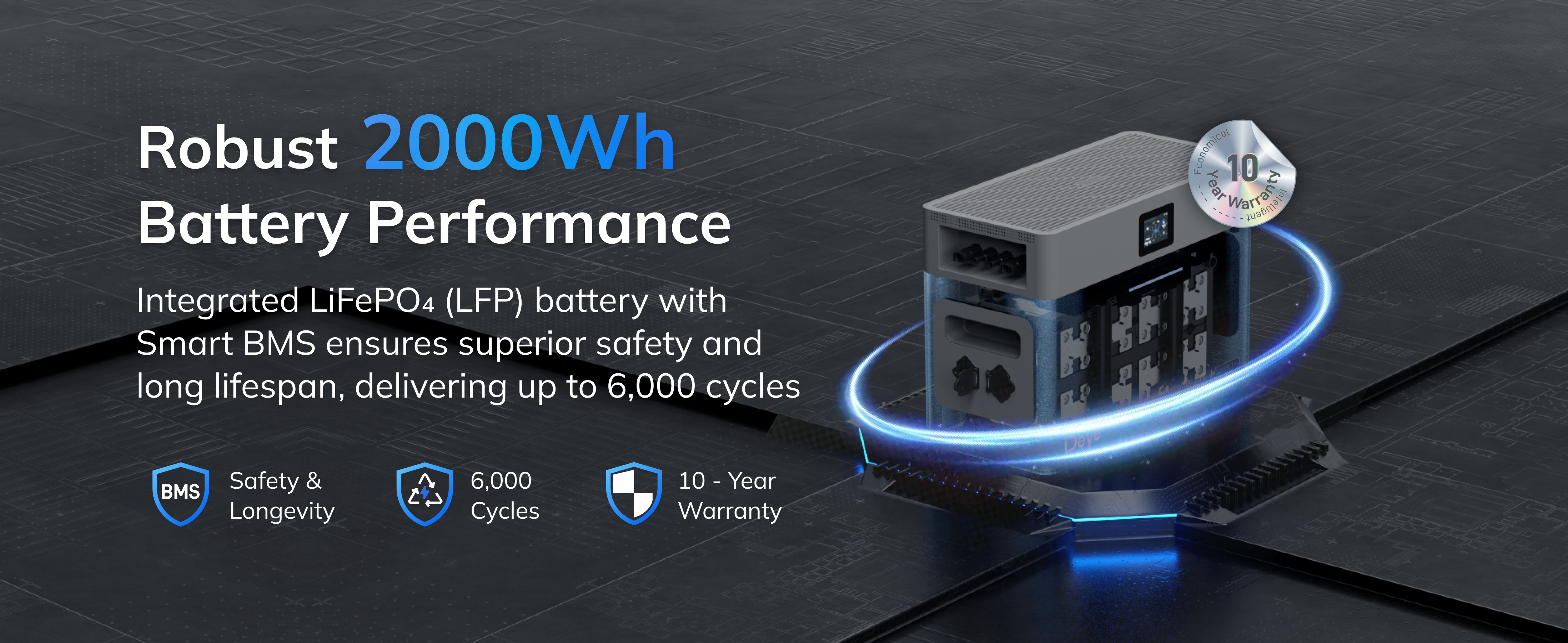 2000Wh LiFePO₄ Battery, Expandable to 10kWh – Built-in BMS ensures 6,000 cycles, 10-year design life (plus 5-year warranty). Stackable modules grow with your energy needs.