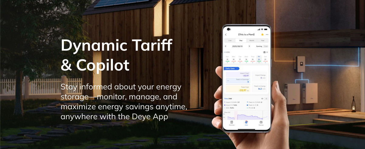 Glance at the built-in smart LCD display for instant battery status, or dive deeper with the Deye Cloud App from your phone. Track how much solar energy you’ve harvested today, see real-time power flow, and adjust settings remotely — whether you’re at home, at work, or on vacation. The Dynamic Tariff & Copilot feature helps you maximize savings by charging and discharging at optimal times.
